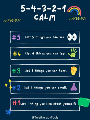 Ground yourself with this easy calming exercise by TeleTherapy Tools. By going through the senses, these steps will put you back in touch with your body, calming your heart and stilling our mind. This infographic may be targeted at children, but the exercise is useful at every age. And the best part, is you can practice is anywhere! This poster is sold on Etsy as a digital download here.