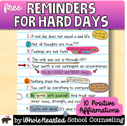 Do you experience depression? This colourful list combats lies about our worth, and reminds us that our feelings aren’t final. Create by Wholehearted School Counseling, this is a great list to print out if you want to practice self talk, and rewrite the lies you believe about yourself. You can download a free high-resolution copy here.