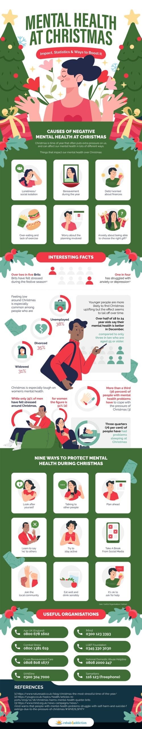 This infographic by Rehab 4 Addiction – an organization based in the UK, reminds us that it’s normal to feel a range of emotions this time of year. Experiencing anxiety from crowds while shopping, becoming stressed about social interactions, and panicking about money are common experiences.