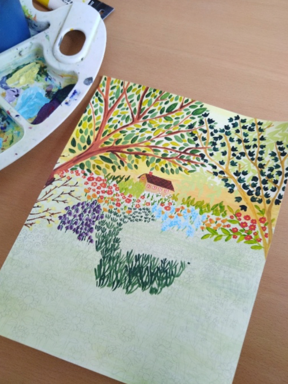 I remember seeing the tubes of vibrant colours; the deep reds, the bright yellows, the aquamarine blues. I sat at the kitchen table, pulled up a painting I’d seen on social media to use as a template, and dipped my brush into the water jar.